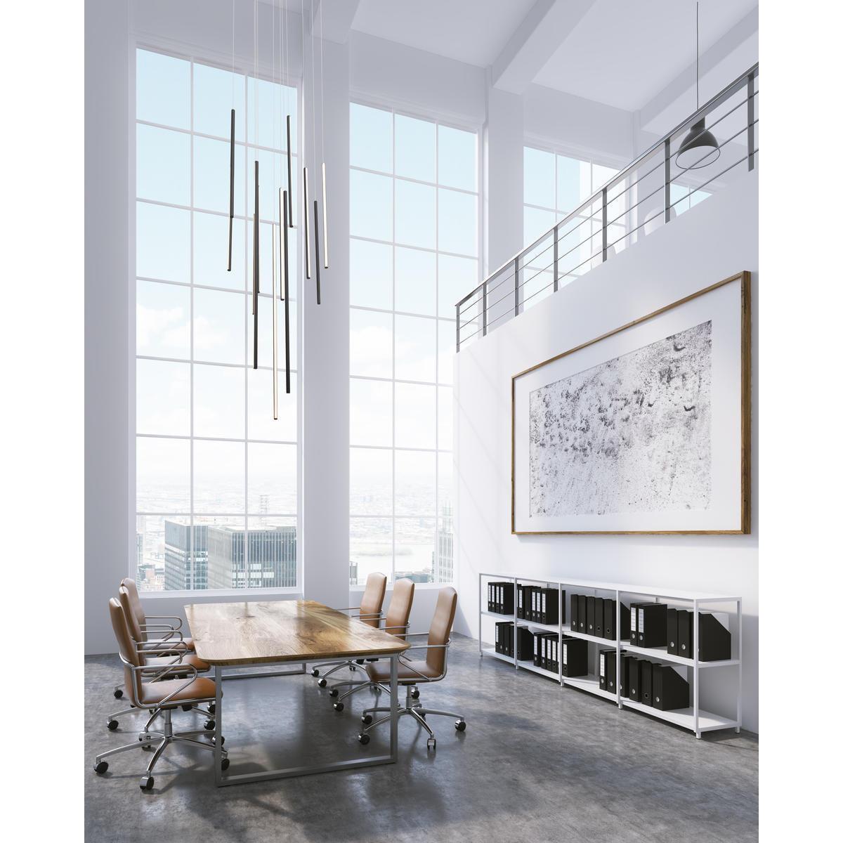 Kuzco Chute 12 Head Black LED Multi Pendant. This fixture features 135W watt energy, made with extruded circular aluminum vertical lamp rods, and flexible silicon rubber diffusers providing an outward emitting light.