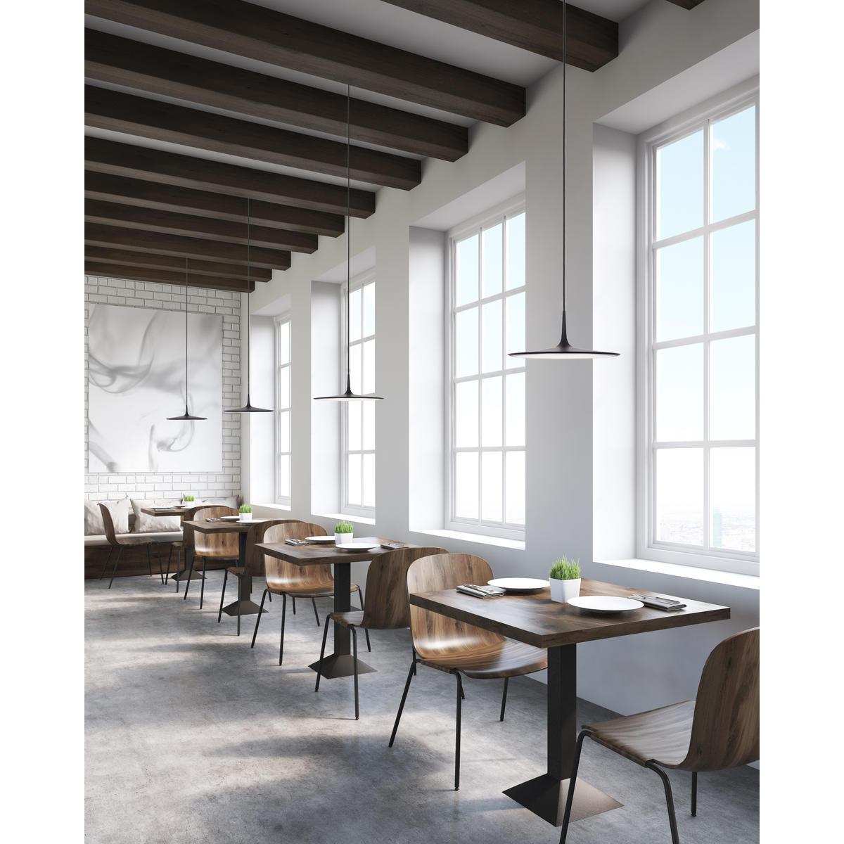 Kuzco Disc 16-in Black LED Pendant. Emitting an even diffusive plane of light in a sleek profile, this pendant features a revolved aluminum cap that supports a thin optic. The fixture is suspended by a matching cloth cable, showcasing excellent detailing and a refined finish.