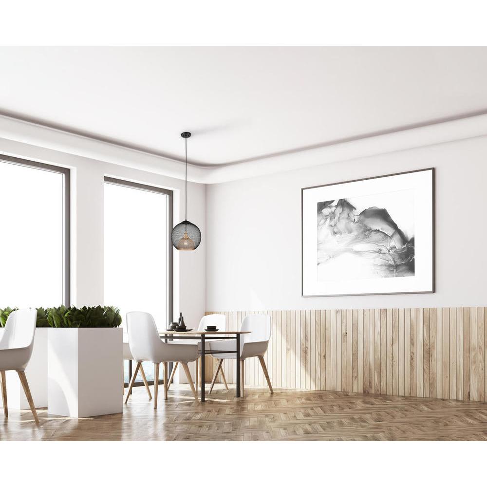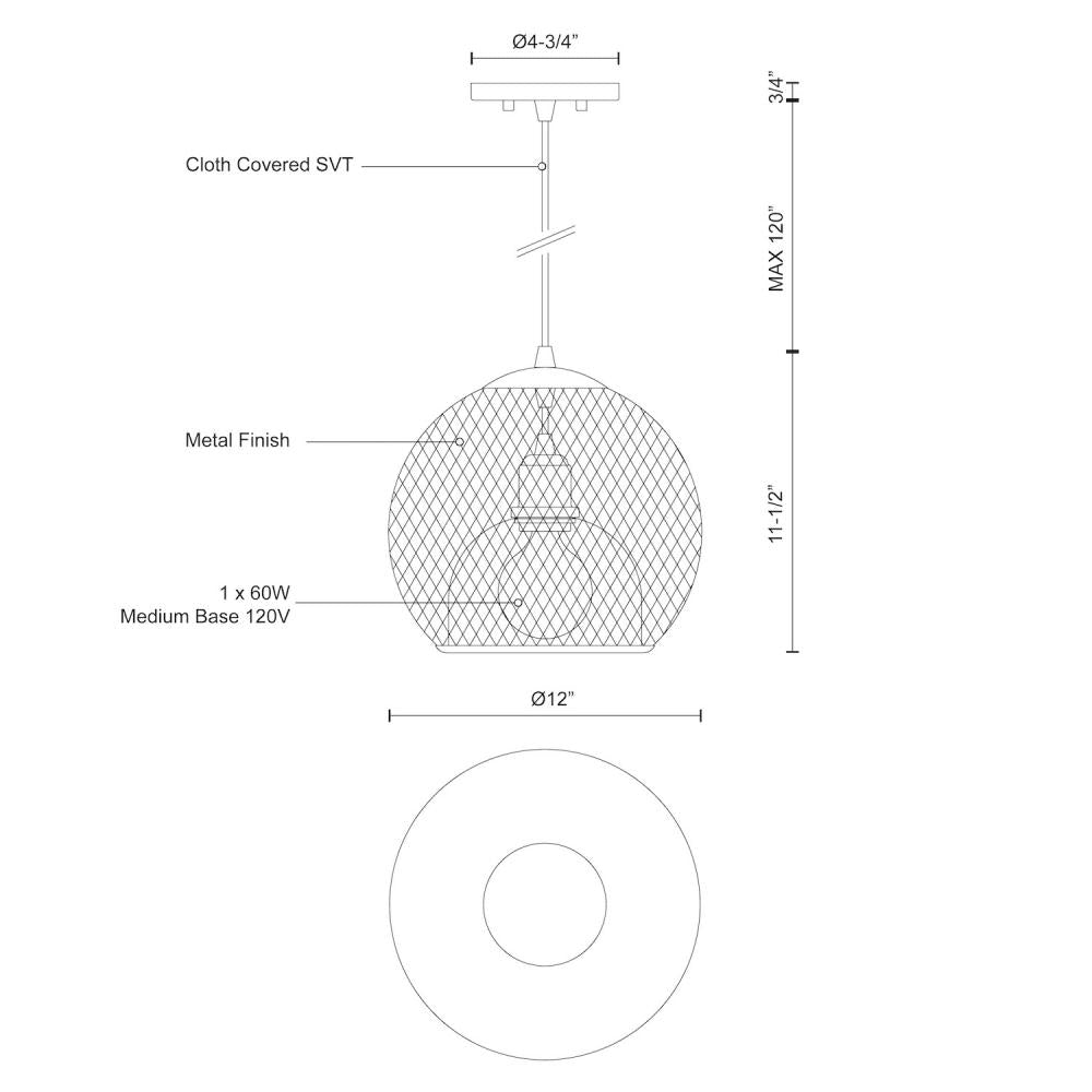 This pendant features a 60W watt single lamp and is designed with a spherical powder-coated wire mesh shade. Color configurations include a uniform black or an exterior black mesh with an inner gold mesh, providing versatility in design.