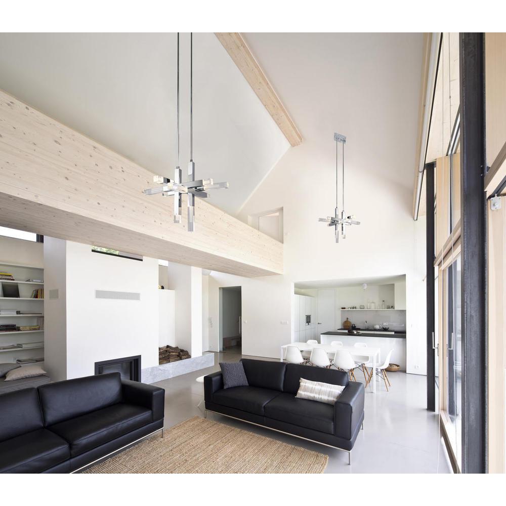 Featuring a 56W watt output, this pendant is suspended from two polished silver rods. It utilizes both man-made and natural elements to create a dramatic vibe. Six polished chrome bars, capped with quartz-like acrylic ends, are stacked perpendicularly, highlighting clean angles and edges.