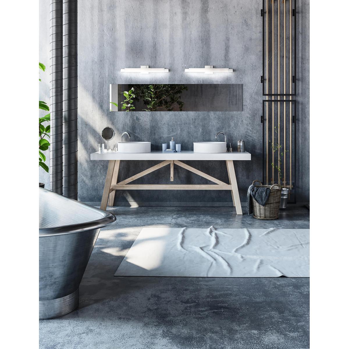 The Soho 27-in Brushed Nickel LED Vanity light fixture is designed by Kuzco. With its bold rectilinear forms and asymmetrical design, the Soho vanity is reminiscent of a Cubist or Art Deco aesthetic.