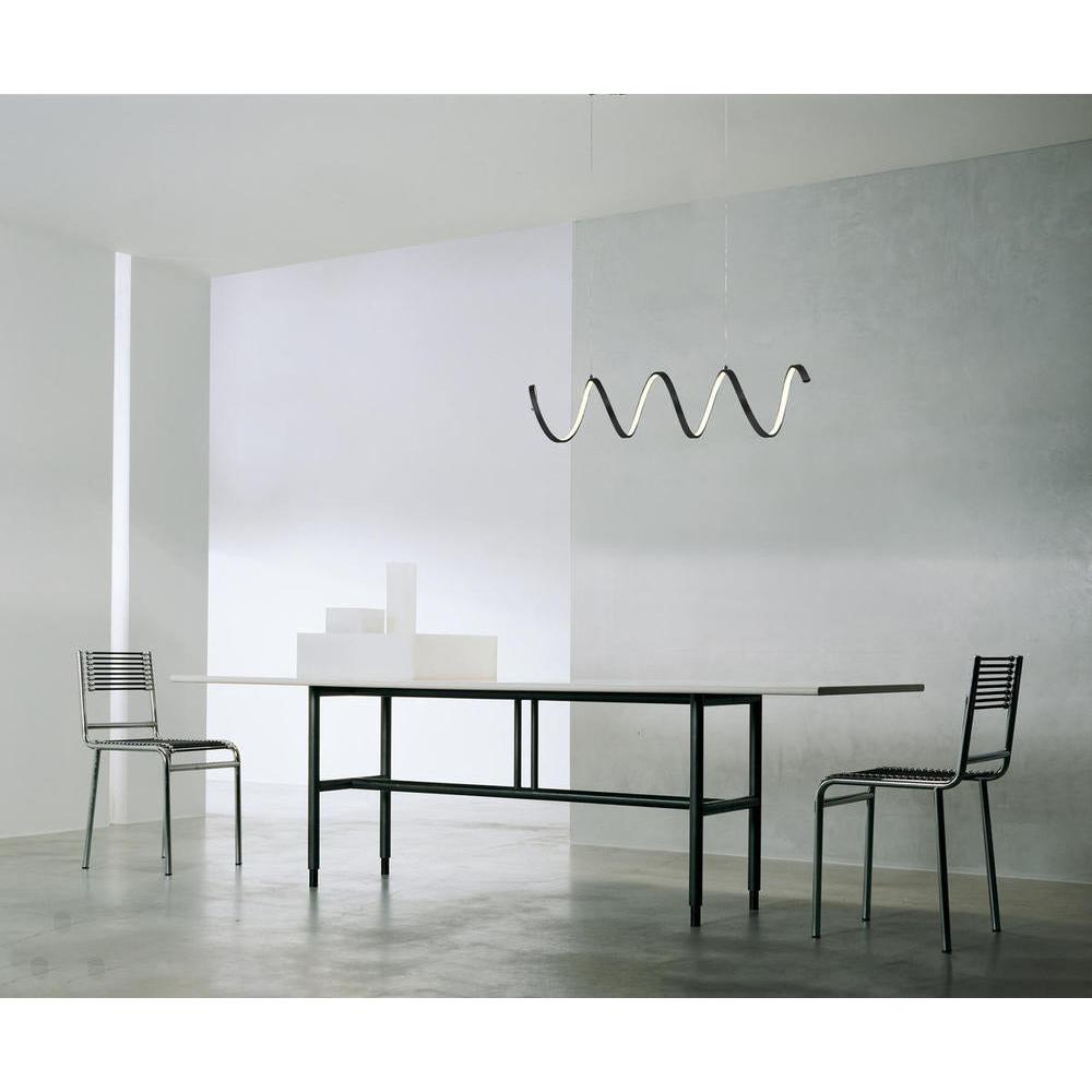 The Synergy 42-in Black LED Linear Pendant by Kuzco features a looping radiant line that casts light across space in a continuous helical path. This linear pendant is characterized by a rolled rectangular extrusion that emits soft light through the silicon opal lens.