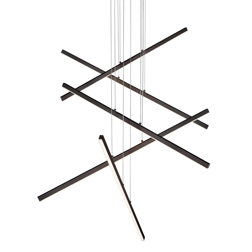 Kuzco Vega 5 Head Black LED Multi Pendant. This unique lighting piece features 158W wattage, with the ability to configure the linear lights at different heights and angles to create distinct sculptural orientations.