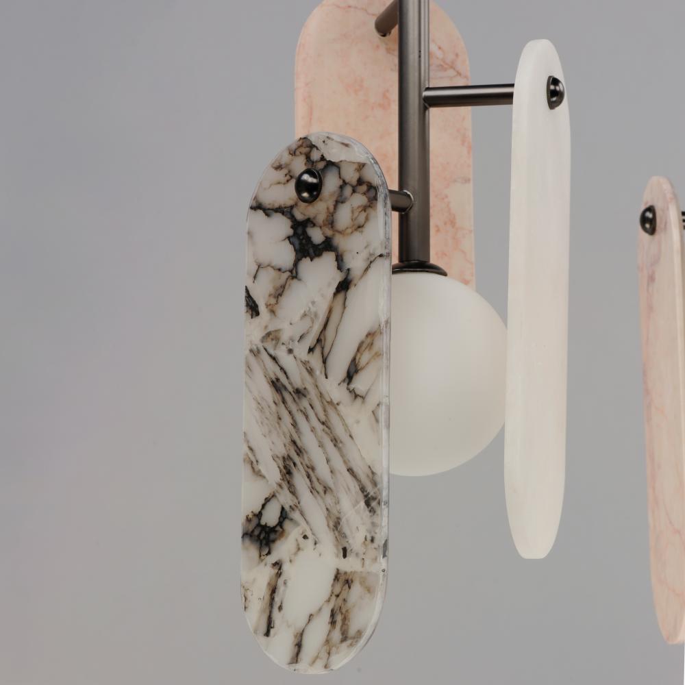 Studio M MEGALITH - STONE SM24815VSGM Pendant Traditional - Gunmetal. A Monument To The Beauty Of Stone The Megalith Collection Is Constructed Using A Robust Iron Stem That Branches Off To Support Various Stone Panels Back Lit By Globes Of White Cased Glass Choose From Stone Panels Sets Including Spanish Alabaster A Pleasantly Pink Rose Jade White Onyx Or A Breathtaking Striae Arya With Dramatic Veining And Dark Grey Color Tone The Enduring Appeal Of The Stone 39 S Character Boosts The Luxurious Nature Of This Design The Framework Is Available In Gunmetal Natural Aged Brass Or Brushed Bronze And Made To Order Configurations For Quick Modifications Studio M MPN: SM24815VSGM