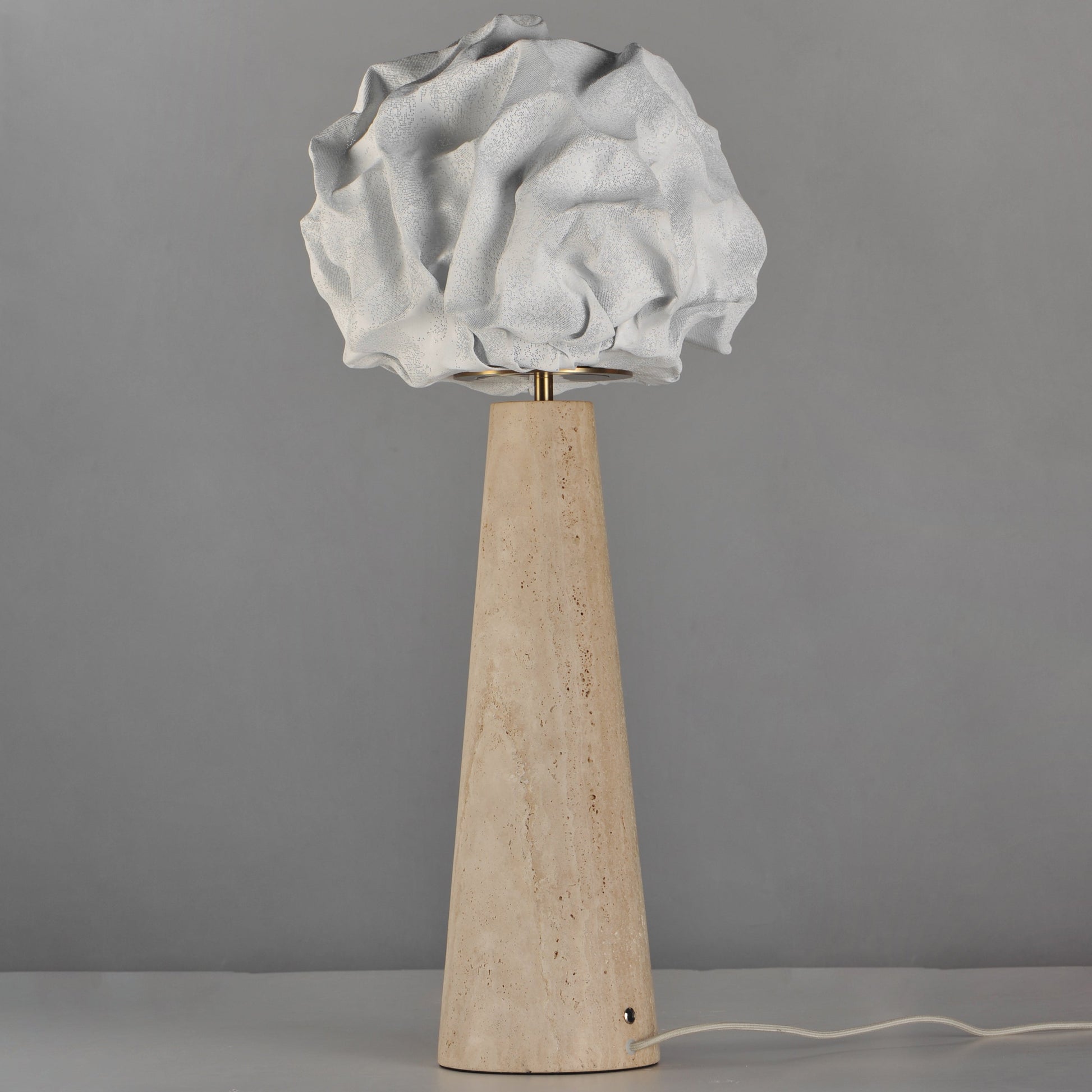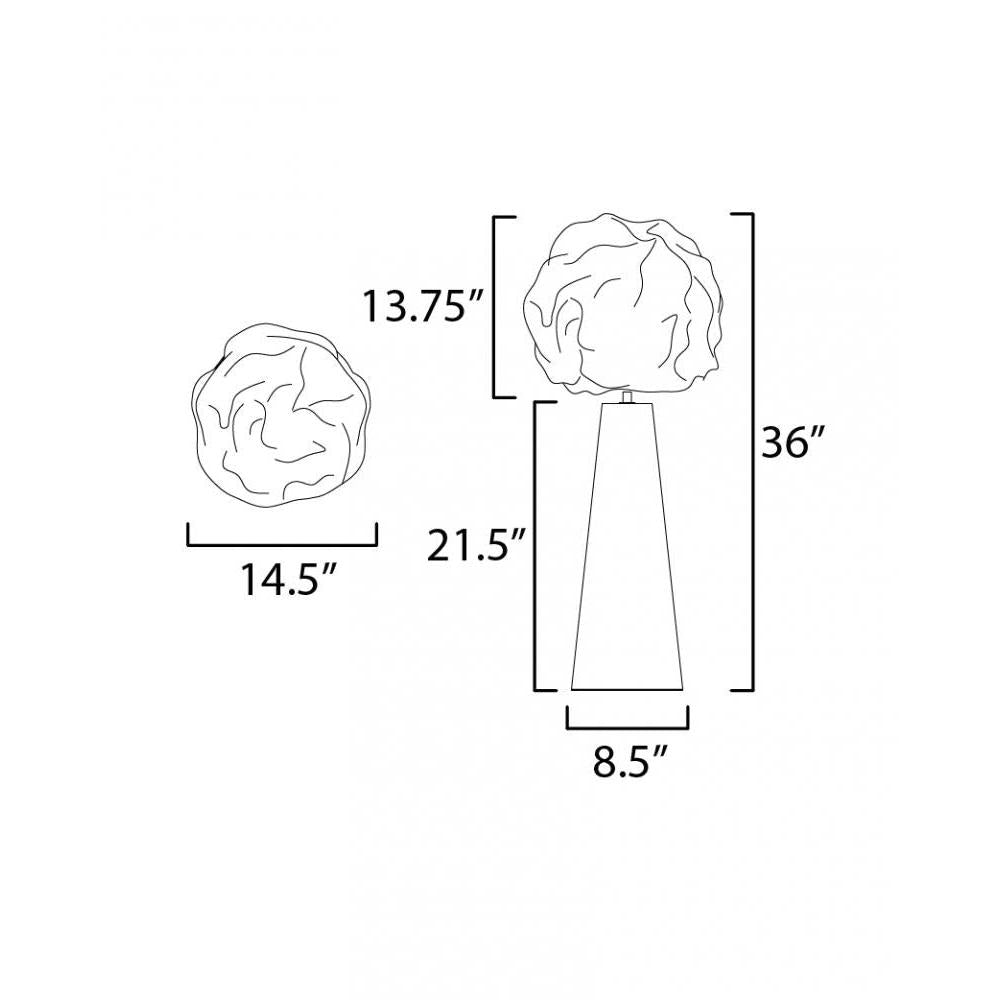 Studio M Shroud SM42409WTNAB Table Lamp - Natural Aged Brass, White Shade. Hand formed metal mesh shades are dimpled and folded into distinctive, artisanal forms. In more traditional lantern and chandelier configurations, these unique shades feature the material suspended within solid brass cages. A large modern, LED pendant features a mesh shade supported atop a sculpted travertine base with brass finial. Similarly, an oversized accent lamp features a large body of travertine at its base with a seemingly floating mesh shade perched atop a brass column. All fixtures include opal white LED lamps. Studio M MPN: SM42409WTNAB